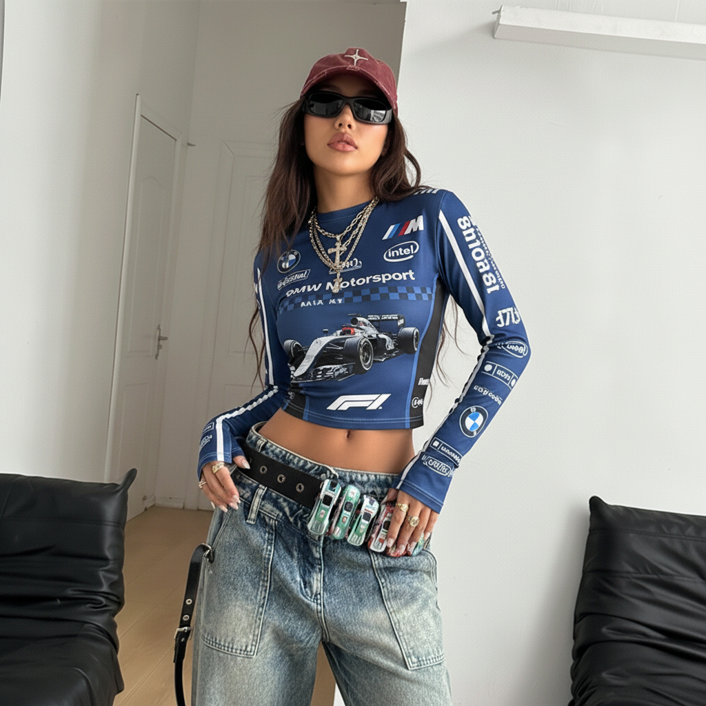 Y2K Racing Long-Sleeved Cropped Top Retro Racing Print Turtleneck T-Shirt